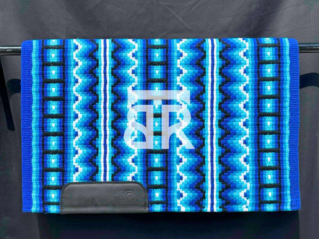 34x44 with stamped wear leathers. Please email us at backroadtradingcompany@gmail.com if you would like to custom order a blanket.