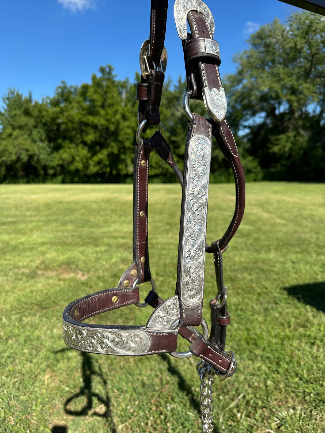 Used Harris horse size show halter includes a matching lead. In great used condition!